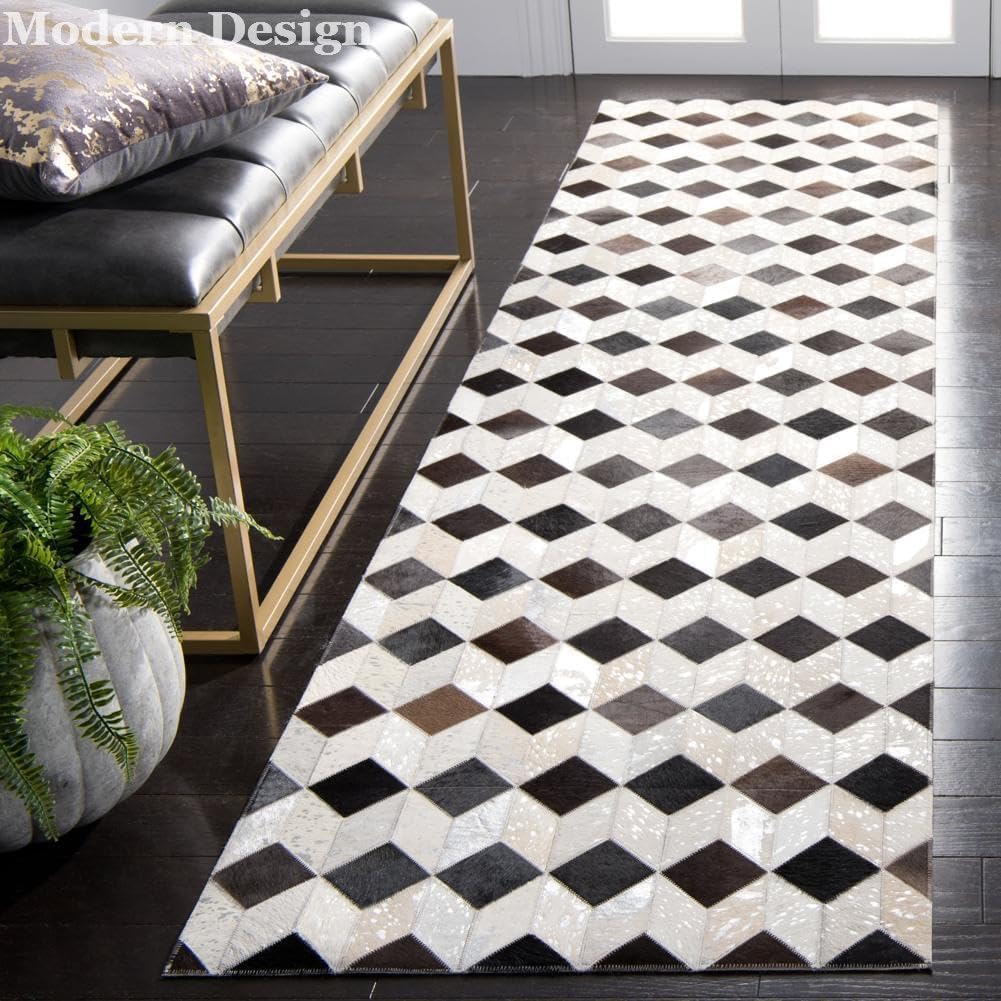 Transform your living space with this stunning Modern Design cowhide leather area rug that seamlessly blends timeless geometric patterns with contemporary style. Featuring an eye-catching Greek key pattern, this rug showcases intricate repeating motifs that add visual depth and architectural interest to any room. The sophisticated color palette combines neutral beige and gray tones with rich brown accents, creating a versatile foundation that complements both modern and traditional interiors. Crafted from genuine cowhide leather, this area rug offers exceptional durability and a luxurious texture that feels as impressive as it looks. The geometric design creates a bold statement piece perfect for living rooms, dining areas, bedrooms, or home offices. Its neutral tones make it easy to coordinate with existing furniture and decor while adding a touch of refined elegance. The carefully constructed patchwork design highlights the natural beauty and unique characteristics of premium leather, ensuring that each rug is truly one-of-a-kind. This modern geometric rug brings together classic design elements with contemporary sensibilities for a look that never goes out of style.